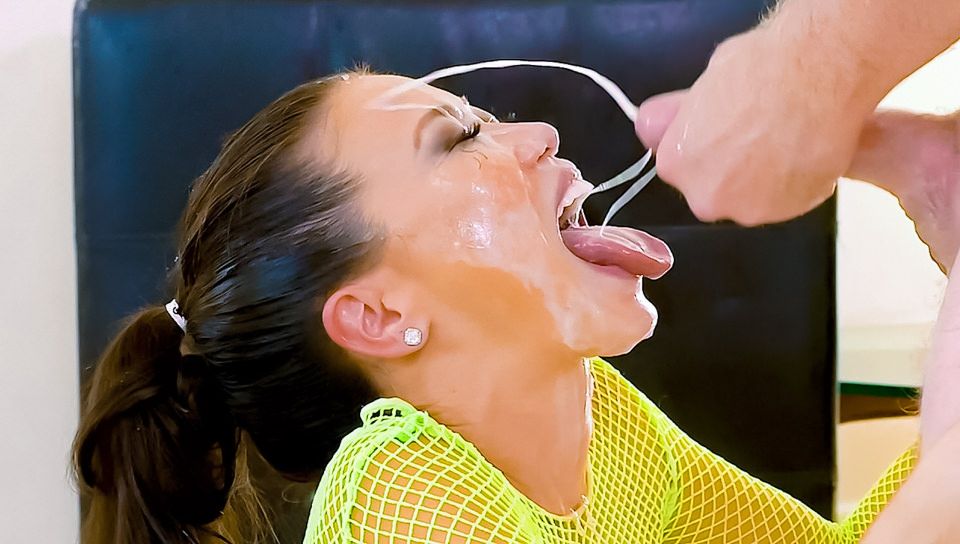 Asian MILF Kalina Ryu, foxy in a neon yellow fishnet top, fingers her shaved slit. The slender slut eagerly services director Jonni Darkko's stiff dick. Jacking his lubricated shaft, Kalina wantonly licks from his ball sack to his asshole and works her full lips all over Jonni's glistening meat. She fills her mouth with whipped cream and spreads it everywhere as she sucks. This sloppy, deep-throat face fuck leaves sexy Kalina a dripping mess of gag spit, sperm and dessert topping!